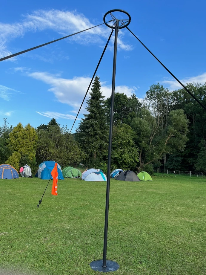 Vertikální ocelová tyč potažená vulkanizovanou gumou (SBR) pro maximální grip. Celková délka 5,2 m, nejdelší díl 1,6 m – vejde do auta. Disciplína vyžadující sílu a odvahu. Vyrábíme ve 2 variantách (3 nebo 4 body kotvení).